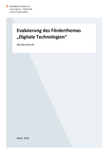 Berger, Florian and Warta, Katharina and Axenbeck, Janna and D'Elloy, Charlotte and Hönicke, Jennifer and Wiscovitch, Montana and Hoeppe, Lena (2026) Evaluierung des Förderthemas „Digitale Technologien“. Technical Report. Bundesministerium für Innovation, Mobilität und Infrastruktur. Wien.
